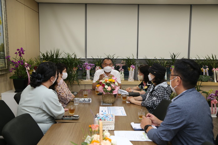 | ▲ 강신만 의장(가운데)이 의장실에서 사립유치원연합회 임원진들과 간담회를 진행하고 있다. (사진제공=도봉구의회) |