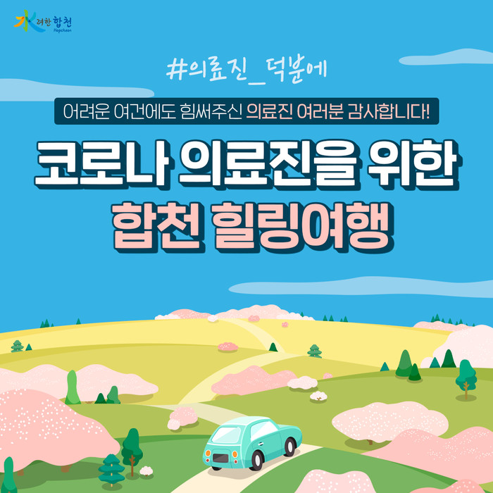 합천군은 코로나19 장기화로 지친 의료진의 일상회복을 위한 합천 힐링여행 지원을 2022. 6월~11월까지 진행한다. 6월 참가자는 지금부터 모집인원 충원 시까지 신청 가능하며, 매월 초에 익월 참가자를 모집하여 선정할 예정으로 웰니스 관광도시 합천에서의 힐링 여행을 통해 코로나로 힘겨운 시간을 버텨낸 의료진에게 마음의 휴식을 가질 수 있는 여행을 지원한다.