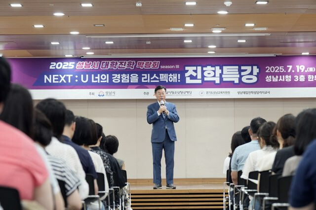 | ▲ 신상진 성남시장이 19일 '2025년 성남시 대학 진로박람회' 특강장에서 인사말을 전하고 있다. |