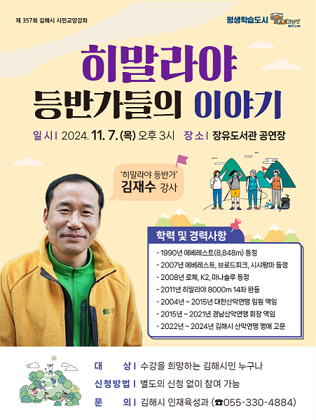 강연 주제는‘히말라야 등반가들의 이야기’로 꿈을 찾아 떠나는 경남 산악인 11명의 도전하는 삶의 이야기와 히말라야 등반 과정, 산속의 생활 등을 진솔하게 공유하며 그 안에서 깨달은 배려와 용기의 중요성을 전달한다.