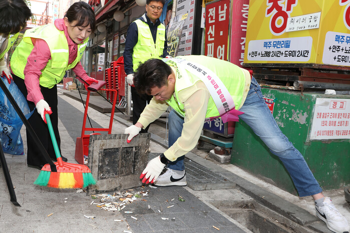 | ▲ 오언석 구청장이 집중호우 시 원활한 배수를 위해 빗물받이에 버려진 담배꽁초 등 각종 쓰레기를 치우고 있다. (사진=도봉구청 제공) |