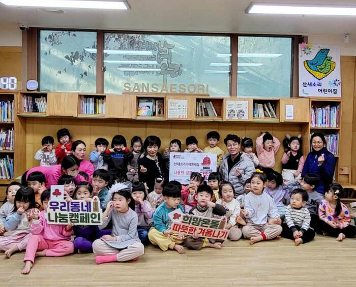 구립 산새소리어린이집은 지난달에 열린 바자회와 교직원들의 성금을 더해 기부금을 마련했다. 학부모와 함께한 바자회에서 먹거리 판매대를 운영하고, 원아들은 집에서 사용하지 않은 물건을 가져와 판매했다