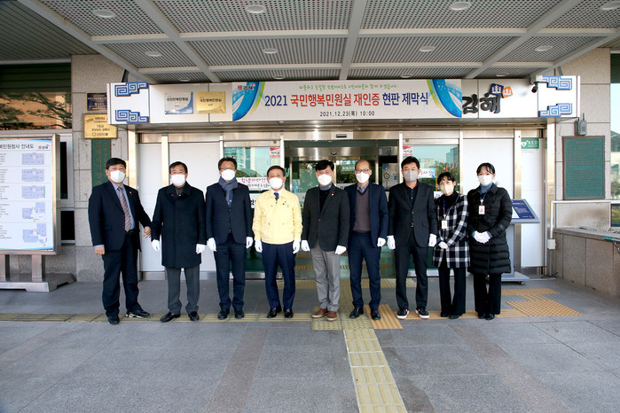 김해시는 23일 시청 민원실 입구에서 허성곤 김해시장, 송유인 김해시의회의장 등이 참석한 가운데 ‘국민행복민원실’ 재인증 현판 제막식을 개최했다.