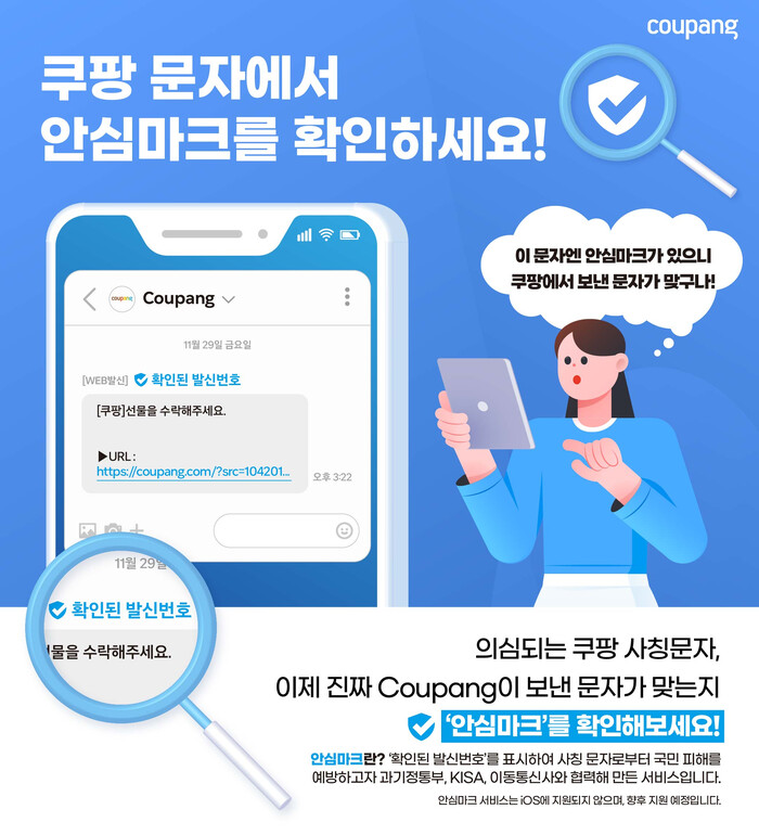 인증된 ‘안심마크’로 쿠팡 사칭문자 쉽게 식별…“스미싱 피해 예방 도울 것으로 기대”