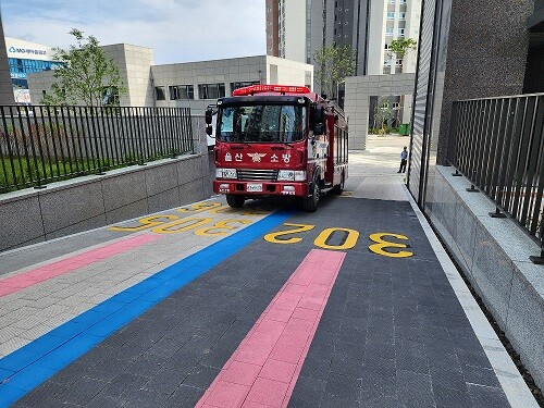 울산소방본부는 9월 19일 울산지역 최초로 중구 복산동 일원 번영로센트리지 아파트 내에 소방차량 출동유도선을 설치한다고 밝혔다.