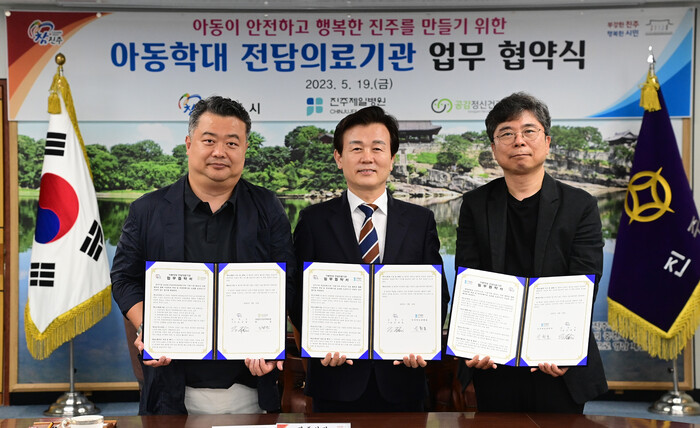 이날 협약식은 조규일 진주시장과 신원호 진주제일병원 내과운영원장, 임광민 공감정신건강의학과의원장이 참석한 가운데 학대 피해 아동에 대한 신속한 의료적 조치와 아동학대 대응 체계를 강화하기 위해 마련됐다.