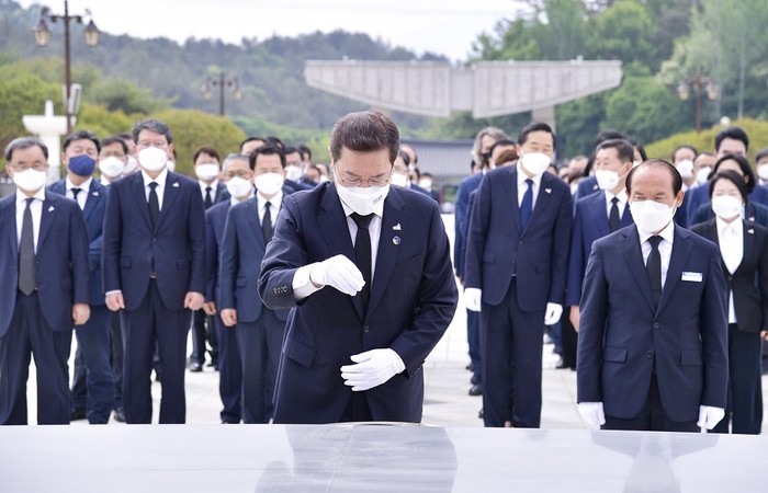 [광주=정찬남 기자] 이용섭 광주광역시장과 김용집 광주시의회 의장 등 합동참배단이 제42주년 5·18민주화운동 기념일을 앞두고 12일 오전 북구 운정동 국립5·18민주묘지를 참배하고 있다./광주광역시 제공