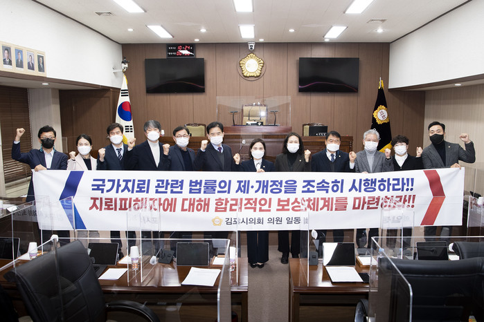 | ▲ ‘국가지뢰 관련 법률의 제·개정 촉구 결의안’을 채택한 김포시의회 의원들이 ‘피해자 지원에 관한 특별법’ 개정을 촉구하고 있다. (사진제공=김포시의회) |