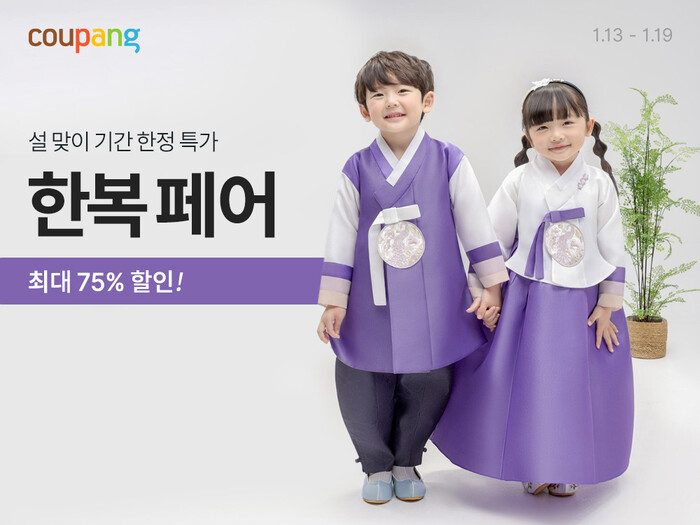 [시민일보 = 문민호 기자] 쿠팡이 설을 맞아 인기 한복과 설빔을 한 자리에서 만나볼 수 있는 ‘한복 페어’를 오는 26일까지 개최한다.