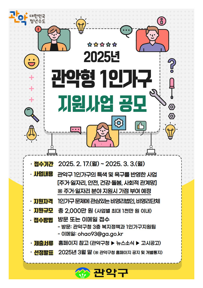 [시민일보 = 문민호 기자] 관악구(구청장 박준희)가 올해 지역내 1인가구 전체를 대상으로 하는 ‘관악형 1인가구 지원사업'과 2024년에 주민이 직접 제안한 ‘대학동 중장년 1인가구 지원사업’의 참여 단체와 기관을 모집한다고 14일 밝혔다.
