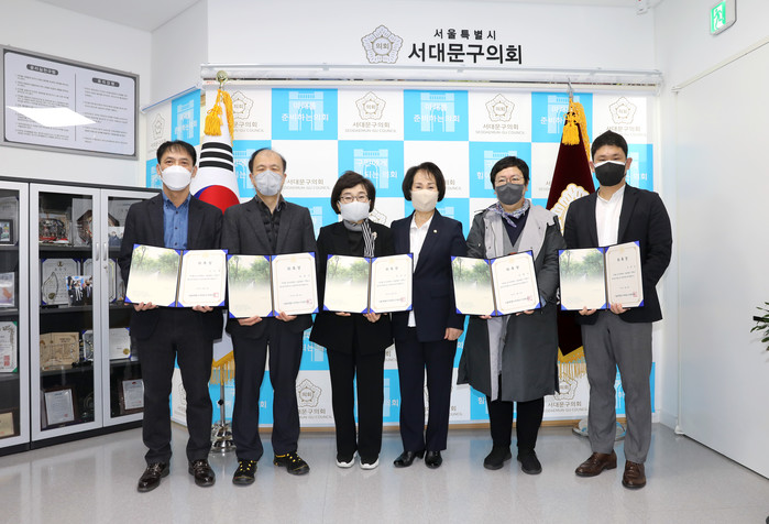 | ▲ 박경희 의장(오른쪽 세 번째)이 2021 회계연도 결산검사 위원들에게 위촉장을 전달한 후 기념촬영을 하는 모습. (사진제공=서대문구의회) |