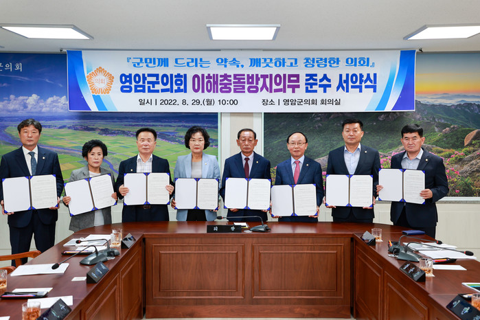 강찬원 군의장은 “군의원 모두가 솔선수범해 이해충돌방지법을 준수하고 사사로운 이익을 추구하지 않으며, 공정하고 청렴하게 의정활동을 수행함으로써 군민으로부터 신뢰받는 깨끗하고 청렴한 의회가 될 수 있도록 더욱 노력해 나갈 것”이라고 말했다.