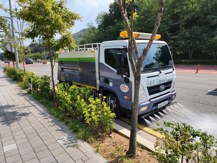 | ▲ 살수차가 구로구 관내를 돌며 물청소를 실시하고 있다. (사진=구로구청 제공) |