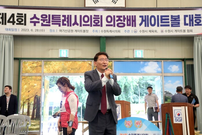 이날 대회는 수원시의회 주최, 수원시 게이트볼협회 주관으로 열렸으며, 시의회 김기정 의장을 비롯한 의원들, 주요 내빈 및 동호회 회원 등 400여명이 참여했다.
