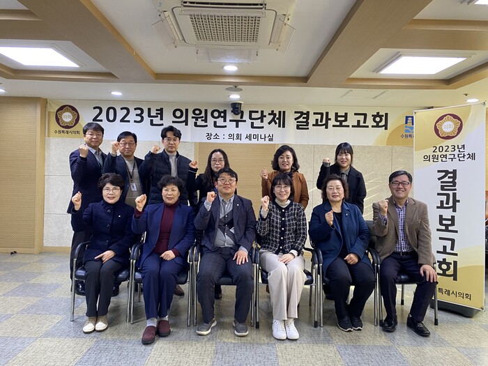 | ▲ 연구활동 결과보고회에 참석한 수원시의원들이 기념촬영을 하고 있다. (사진=수원시의회 제공) |