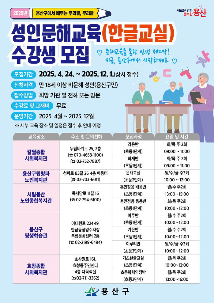 [시민일보 = 문민호 기자] 용산구(구청장 박희영)가 지난 3월 ‘2025년 교육부 성인문해교육지원사업 공모사업’에 선정돼, 최근 성인문해교육 프로그램을 운영하고 있다고 9일 밝혔다.