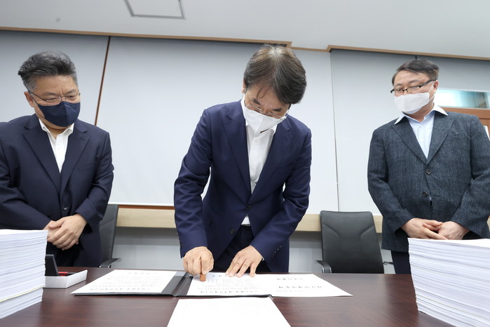 이동환 고양특례시장이 7월 1일 첫 공식업무를 시작하기에 앞서 사무인계인수서에 날인하고 있다.(사진제공=고양시청)