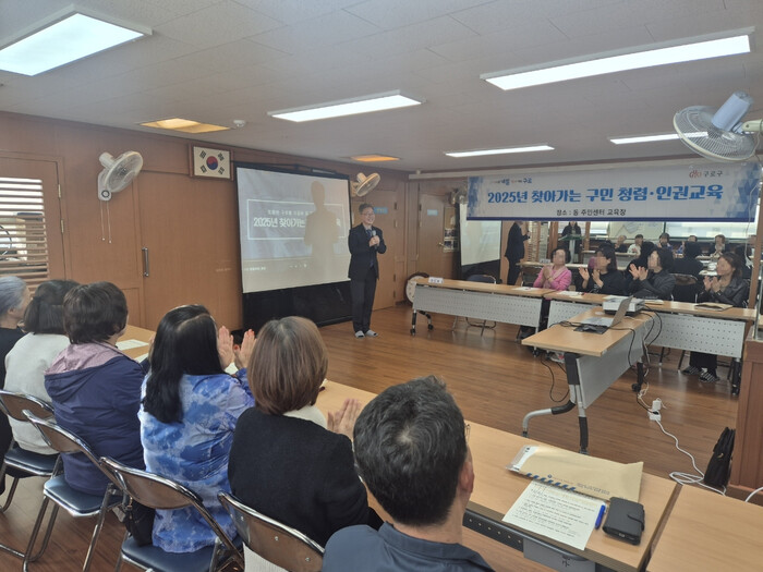| ▲ 지난 24일 장인홍 구로구청장이 개봉3동 주민센터에서 진행된 2025년 찾아가는 구민 청렴·인권교육에서 인사말을 하고 있다. (사진=구로구청 제공) |