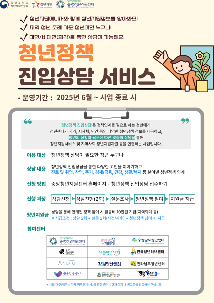 진로‧주거‧생활 등 다양한 분야 맞춤 상담 제공, 정책 연계 시 지역화폐 10만 원 지원