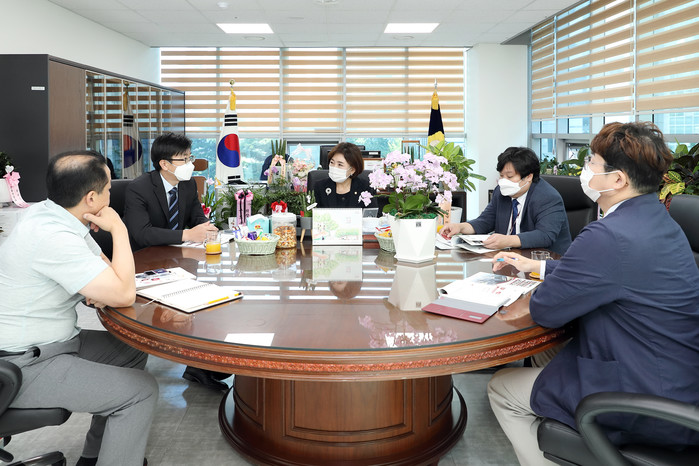 | ▲ 곽윤희 의장(가운데)이 조금준 단장(왼쪽 두 번째)와 대화를 나누고 있는 모습. (사진제공=구로구의회) |