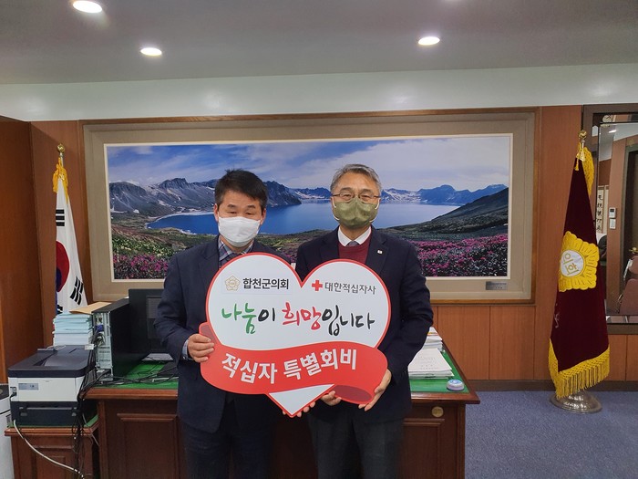 합천군의회 배몽희의장이 28일 오전 대한적십자 경남지사에 특별회비 50만원을 전달했다. 회비는 의회를 방문한 구종환 대한적십자 경남지사 구종환 부회장에게 전달됐다.