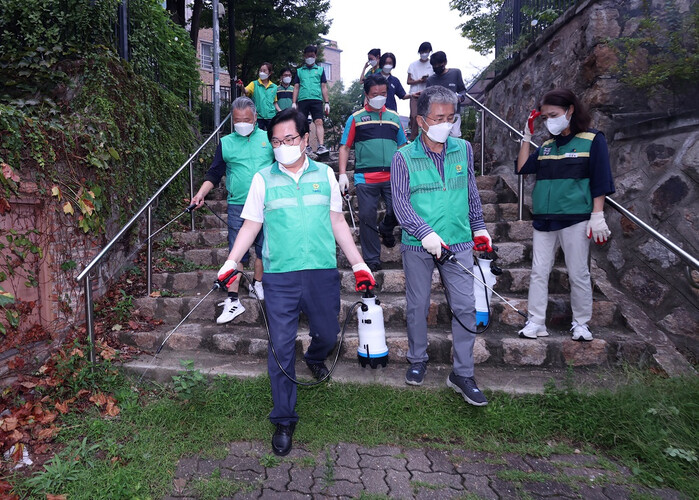 | ▲ 박일하 구청장이 지난해 9월 관내 상도1동 일원에서 새마을 봉사단과 방역 작업을 하고 있다. (사진=동작구청 제공) |