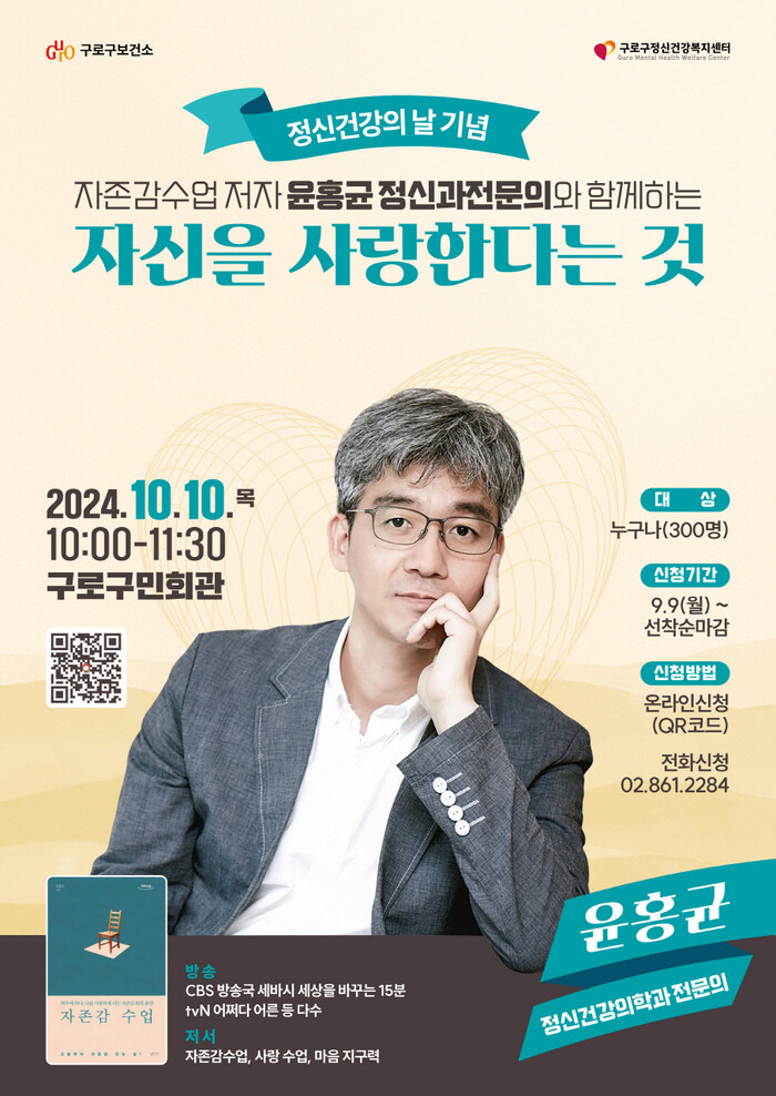 또한 구민회관 강당에서 지역내 주민 300명을 대상으로 ‘자존감 수업’의 저자 윤홍균 정신건강의학과 전문의가 ‘자신을 사랑하는 것’이라는 주제로 정신건강 관리의 중요성에 대해 강연한다.