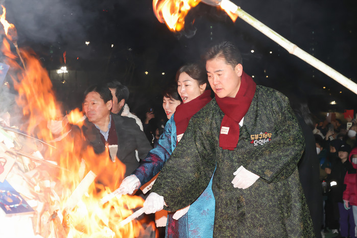 도봉구는 최근 중랑천에서 정월대보름 달맞이축제를 개최했다. 축제는 길놀이를 시작으로 대취타 연주 등 다채로운 축하공연과 축원문 낭독 및 달집태우기와 불꽃놀이 등으로 진행됐다. 사진은 구민과 함께 소원 성취를 기원하며 달집에 불을 붙이고 있는 오언석 구청장(오른쪽)의 모습. (사진=도봉구청 제공)