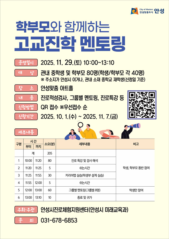 본 프로그램은 안성시 주소지를 두고 있거나 관내 중학교 재학 중인 중학생과 학부모 총 80명을 대상으로 하며, 신청은 10월 1일(수)부터 11월 7일(금)까지 QR코드를 통해 선착순 접수가 가능하다.