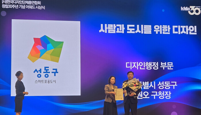[시민일보 = 박소진 기자] 성동구(구청장 정원오)가 최근 코엑스 그랜드컨퍼런스룸에서 열린 ‘KFDA 창립 30주년 어워드’ 시상식에서 ‘2025 사람과 도시를 위한 디자인’디자인 행정 부문 수상기관으로 선정되는 영예를 안았다.