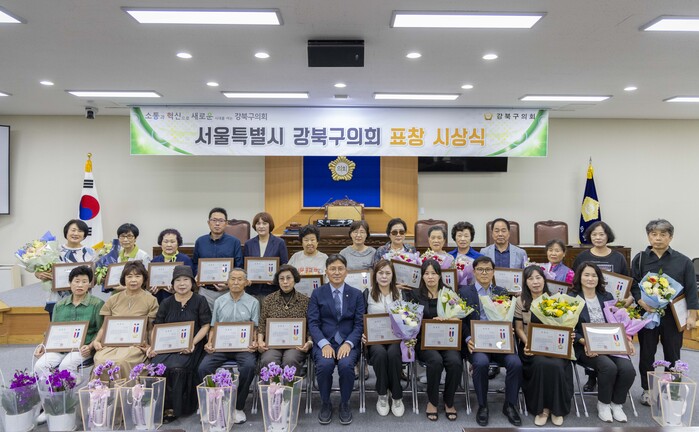 [시민일보 = 여영준 기자] 서울 강북구의회(의장 최치효)가 최근 의회 3층 본회의장에서 지역발전 유공자 21명에 대한 표창 수여식을 열었다.