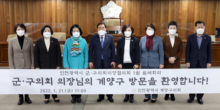 | ▲ 계양구의원들이 인천광역시군·구의회 의장들의 계양구 방문을 환영하고 있다.(사진제공=계양구의회) |