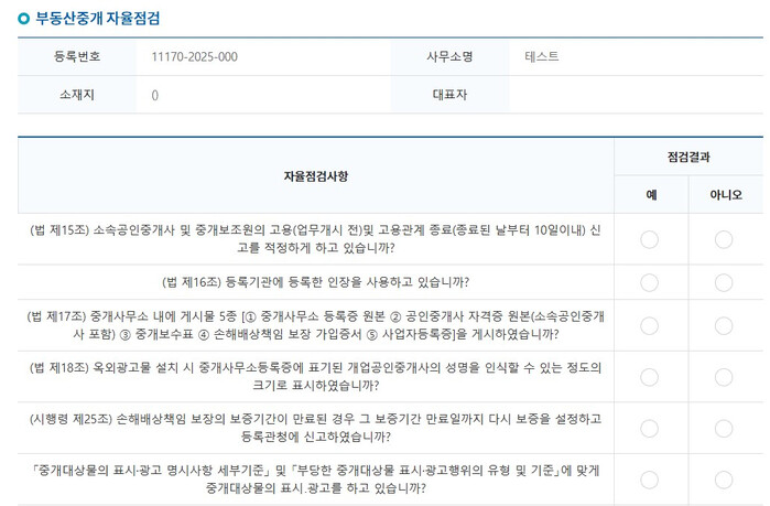[시민일보 = 문민호 기자] 용산구(구청장 박희영)는 9월 15일부터 10월 31일까지 지역 내 개업공인중개사 880여명을 대상으로 인터넷 자율점검 서비스를 제공한다. 이번 점검은 공인중개사들이 관련 규정을 스스로 진단·확인할 수 있도록 마련된 디지털 기반 비대면 점검 체계다.