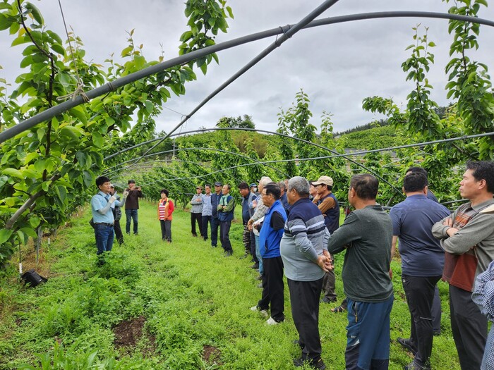 이번에 실시한 현장교육은 농촌진흥청 배 연구소 송장훈 박사를 초빙하여 농가 실천 중심의 품종별 저온피해 예방 및 사후 과원 관리기술에 대해 배우는 시간을 가졌다.