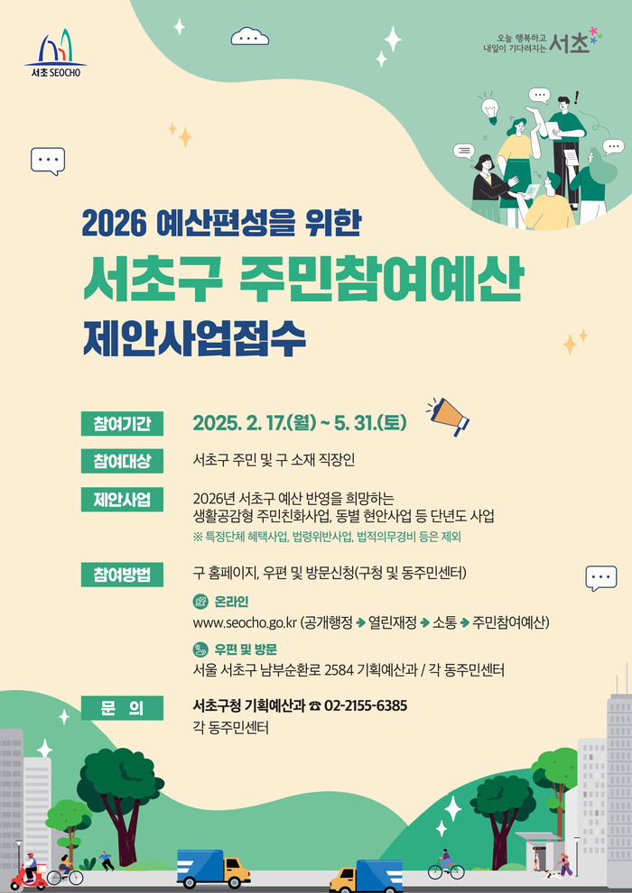 [시민일보 = 박소진 기자] 서초구(구청장 전성수)가 오는 5월31일까지 주민들이 직접 필요한 사업을 제안하고 결정하는 ‘서초구 주민참여예산’ 제안사업을 신청받는다고 밝혔다.