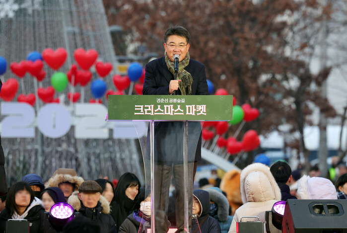 | ▲ 오승록 노원구청장은 21일 오후 서울 노원구 경춘선 공릉숲길 열린 ‘경춘선 공릉숲길 크리스마스 마켓’ 행사에 참석해 인사말을 하고 있다. (사진=노원구청 제공) |
