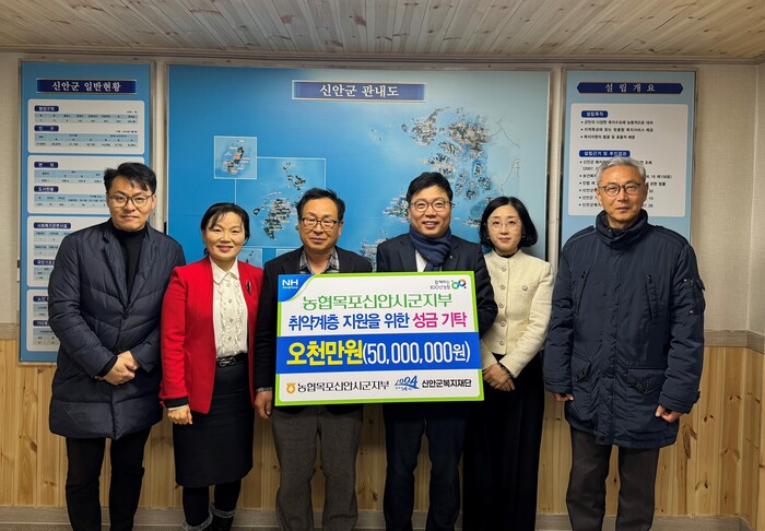 [신안=황승순 기자]NH농협은행 목포신안시군지부(지부장 김상호)는 24일 (재)신안군복지재단(이충만 이사장)을 방문해 기부금 5천만 원을 전달했다고 밝혔다.