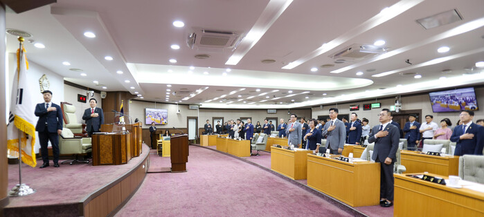 | ▲ 지난 8월28일 열린 제318회 임시회 1차 본회의에서 의원들이 국민의례를 하고 있다. (사진=강동구의회 제공) |