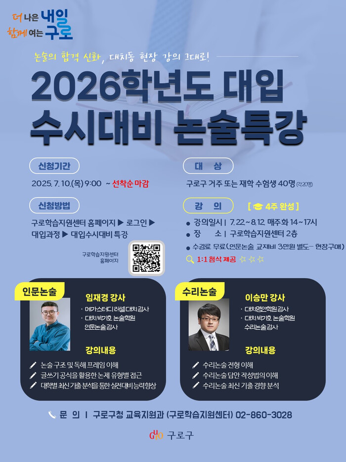 이번 특강은 사교육비 부담 경감과 수험생의 논술 역량 강화를 위해 마련됐으며, 7월 22일부터 8월12일까지 매주 화요일 오후 2시부터 5시까지 총 4회에 걸쳐 구로학습지원센터에서 진행된다.