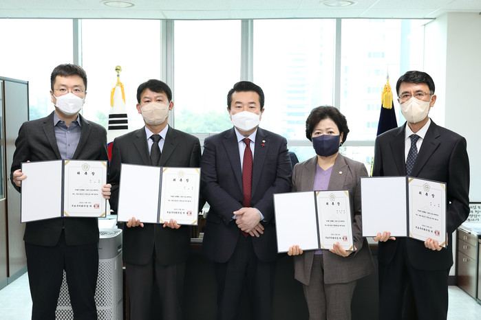 | ▲ 지난 25일 구로구의회 의장실에서 박동웅 의장(가운데)과 결산검사위원들이 위촉식에서 기념촬영을 하고 있는 모습. (사진제공=구로구의회) |