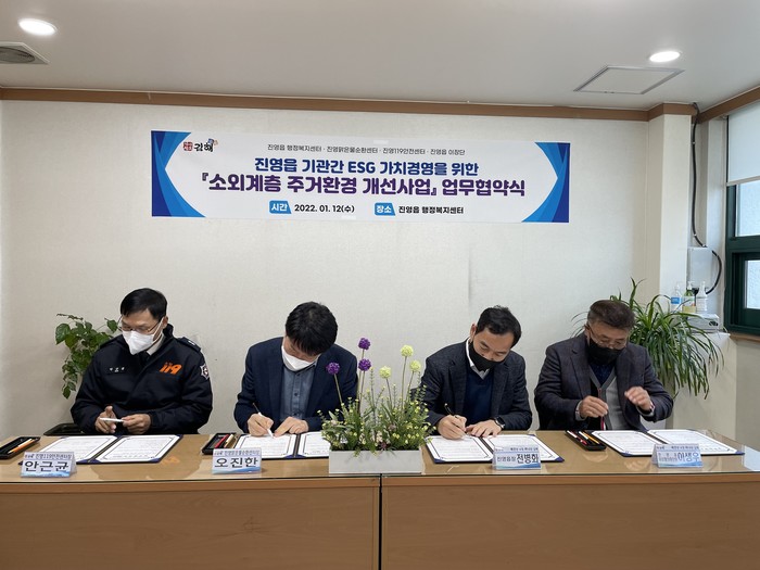 김해시, 진영읍 행정복지센터(읍장 전병화)는 12일 관내 3개 기관(진영 맑은물 순환센터, 진영119안전센터, 진영읍 이장단)과 ESG 가치경영을 위한 소외계층 주거환경 개선사업 업무협약을 체결하고 설 명절을 앞두고 구도심 지역에 첫 사업을 추진하기로 했다.