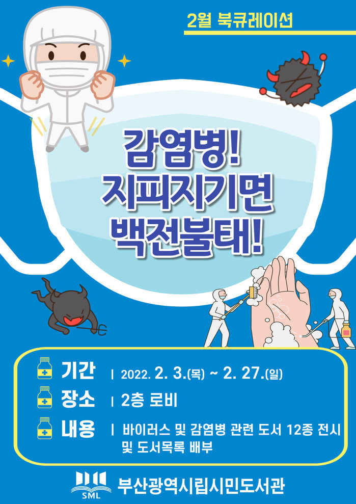 부산광역시립시민도서관(관장 김흥백)은 시민들에게 코로나19 등 감염병에 대한 정확한 정보를 제공하기 위해 2월 3일부터 한 달간 도서관 2층 로비에서 북큐레이션 ‘감염병, 지피지기면 백전불태!’행사를 진행한다.