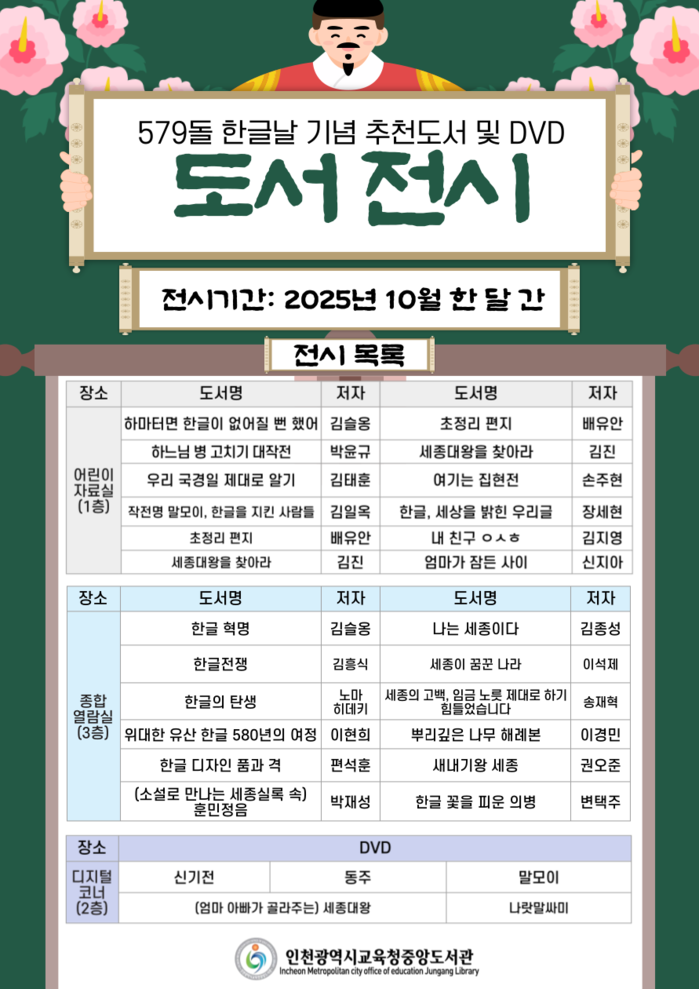 [인천=문찬식 기자] 인천광역시교육청중앙도서관(관장 곽미혜)은 한글 창제 579돌을 기념해 10월 한 달 동안 ‘한글날 추천 도서 및 DVD’ 전시를 운영한다.