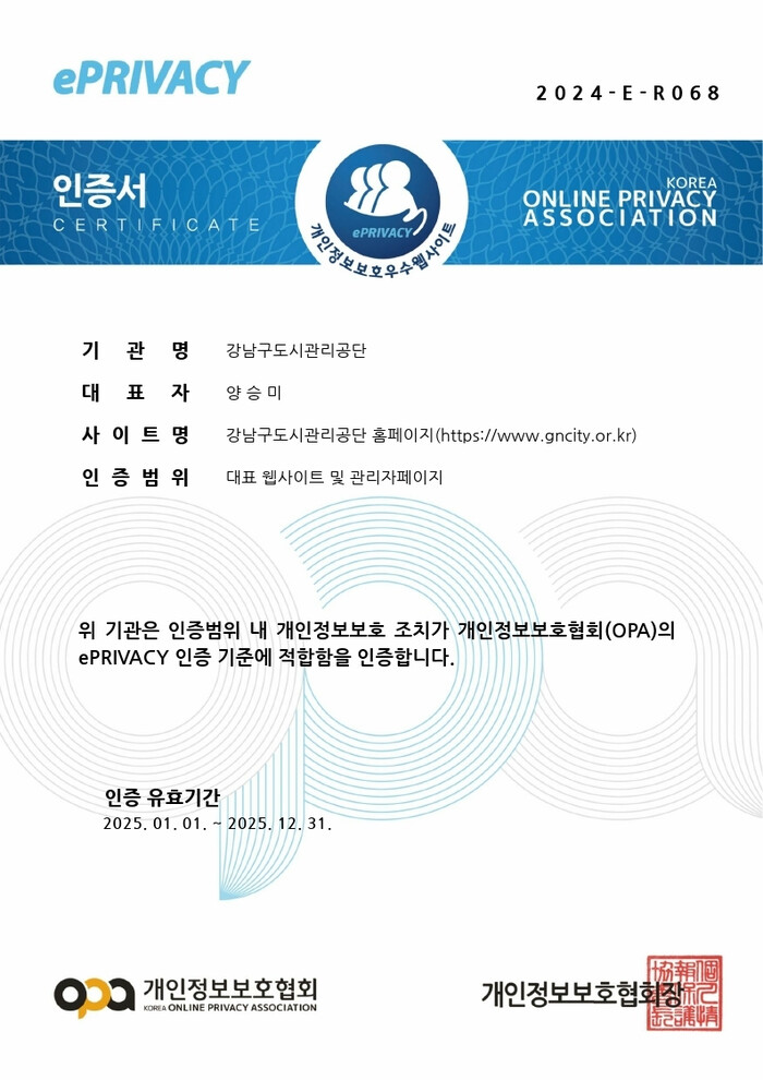 강남구도시관리공단 홈페이지는 ▲개인정보의 생명주기 ▲개인정보의 관리적 보호조치 ▲개인정보의 기술적 보호조치 총 3개 영역의 25개 인증기준을 통과하여 개인정보보호 법령을 성실히 준수하고 있음을 인정받았다.