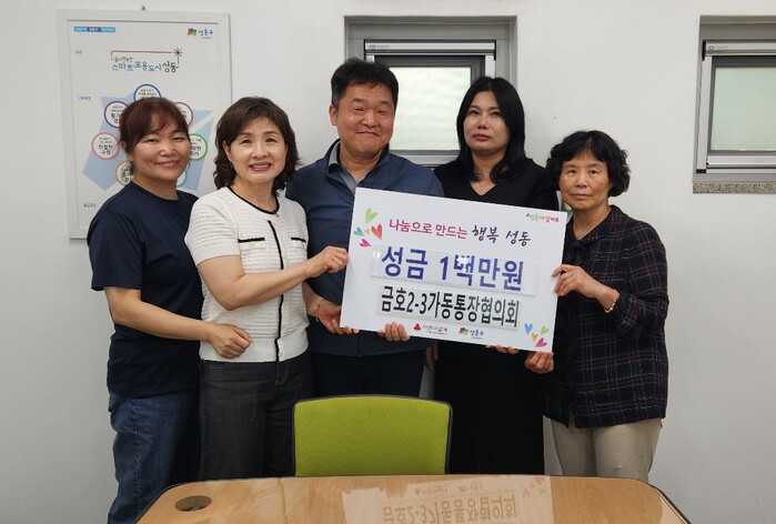 | ▲ 성동구 금호2-3가동 통장협의회에서 성금 1백 만원 기탁하는 모습. (사진=성동구청 제공) |