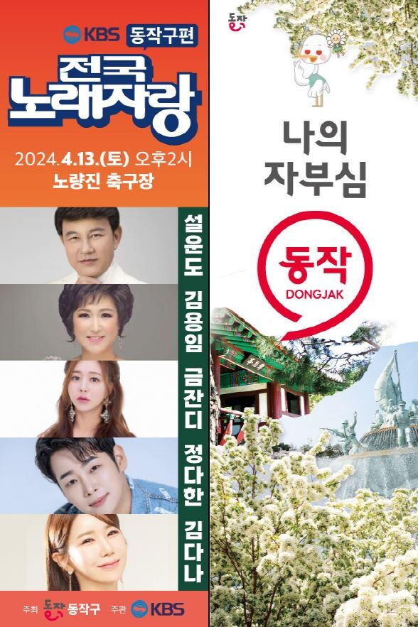 구가 주최하고 KBS 한국방송이 주관하는 이번 ‘전국노래자랑 동작구편’은 예심을 거쳐 본선에 진출한 15개 팀의 경연으로 펼쳐진다. MC 남희석의 진행과 더불어 설운도, 김용임, 금잔디, 정다한, 김다나 등 다수의 초대 가수가 출연해 주민에게 즐거움을 선사할 예정이다.