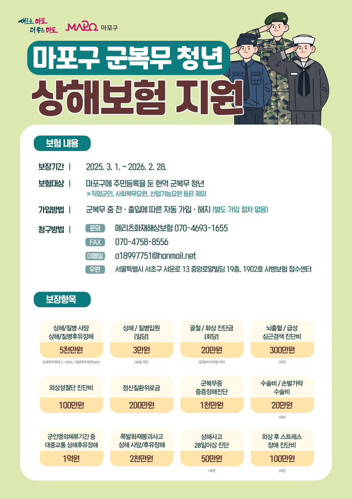 ‘군복무 청년 상해보험’에 대한 자세한 내용은 마포구 누리집을 참고하거나 보험사로 문의하면 안내받을 수 있다.