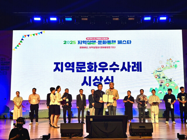 | ▲ ‘2025 지역상생·문화동행 페스타’ 지역문화 우수사례 시상식에서 노원문화재단 강원재 이사장(오른쪽)이 지역문화향유 부문 ‘전국지역문화재단연합회장상’을 수상하고 있다. (사진=노원문화재단 제공) |