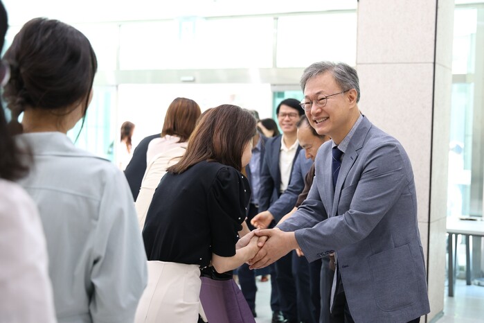 | ▲ 장인홍 구로구청장(오른쪽)이 11일 정례조례 후 직원들과 악수를 나누며 취임 100일을 함께 축하하고 있다. (사진=구로구청 제공) |