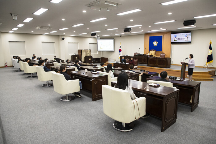 학생들은 의회 3층 본회의장에서 구의회의 운영과 역할에 대해 배우고 궁금한 점들에 대해 의원들과 질의 응답하는 시간을 보냈다.